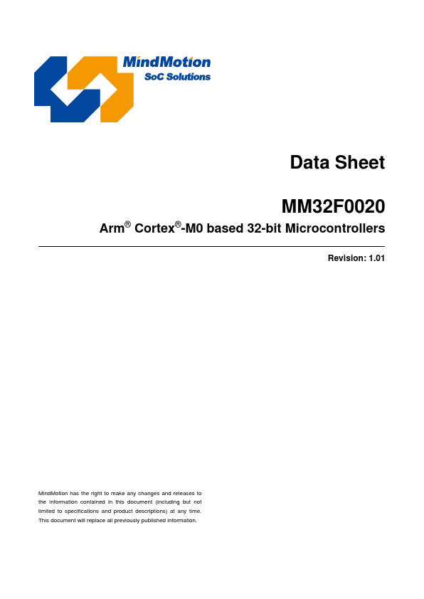 1 Introduction 1.1 Overview The MM32F0020 microcontrollers are based on Arm® Cortex®-M0 core. These devices have a maximum clocked frequency of 48MHz, built-in 32KB Flash storage, and contain and extensive range of peripherals and I/O ports.