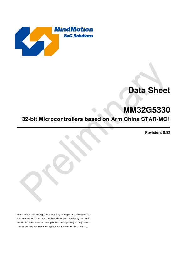 1 Introduction 1.1 Overview The MM32G5330 microcontrollers are based on Arm China STAR-MC1 core. These devices have a maximum clocked frequency of 180MHz, built-in 128KB Flash storage, 32KB SRAM, all Flash and SRAM support ECC, and contain an extensive range of peripherals and I/O ports.
