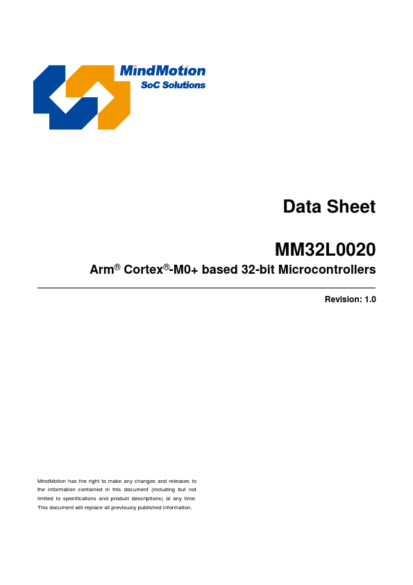 1 Introduction 1.1 Overview The MM32L0020 microcontrollers are based on Arm® Cortex®-M0+ core. These devices have a maximum clocked frequency of 48MHz, built-in 32KB Flash storage, and contain an extensive range of peripherals and I/O ports.