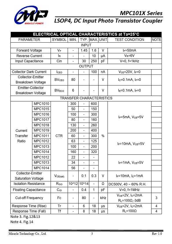 The MPC101X series bine an AlGaAs infrared emitting diode as the emitter which is optically coupled to a silicon planar phototransistor detector in a plastic LSOP4 package with different lead forming options. With the robust coplanar double mold structure, MPC101X series provide the most stable isolation.
