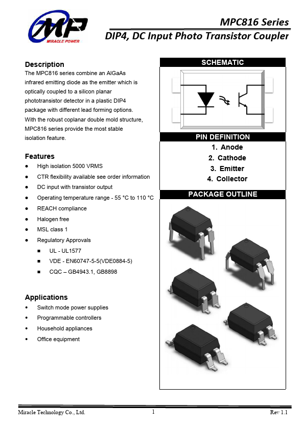 The MPC816 series bine an AlGaAs infrared emitting diode as the emitter which is optically coupled to a silicon planar phototransistor detector in a plastic DIP4 package with different lead forming options. With the robust coplanar double mold structure, MPC816 series provide the most stable isolation.
