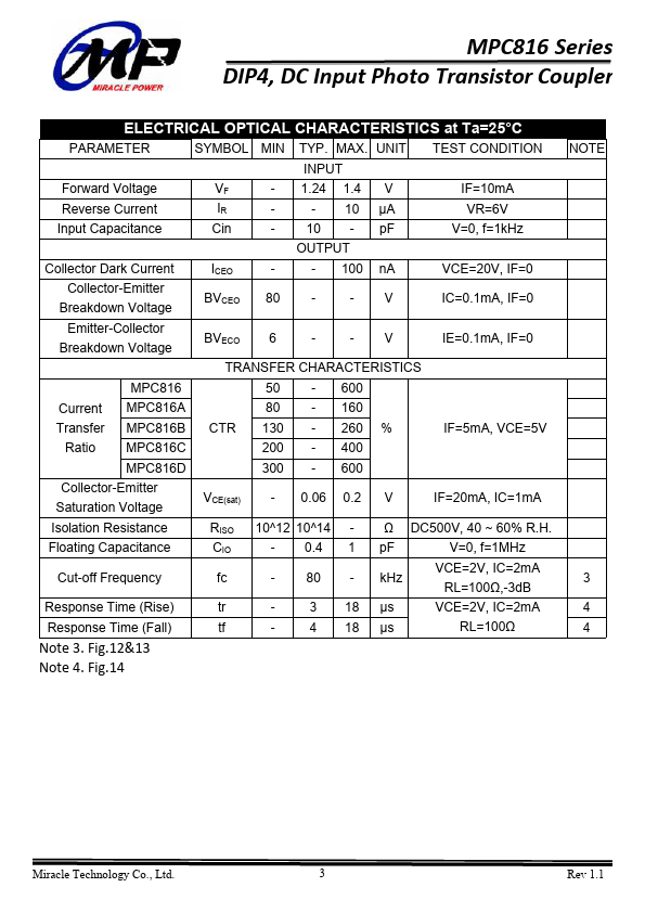 The MPC816 series bine an AlGaAs infrared emitting diode as the emitter which is optically coupled to a silicon planar phototransistor detector in a plastic DIP4 package with different lead forming options. With the robust coplanar double mold structure, MPC816 series provide the most stable isolation.