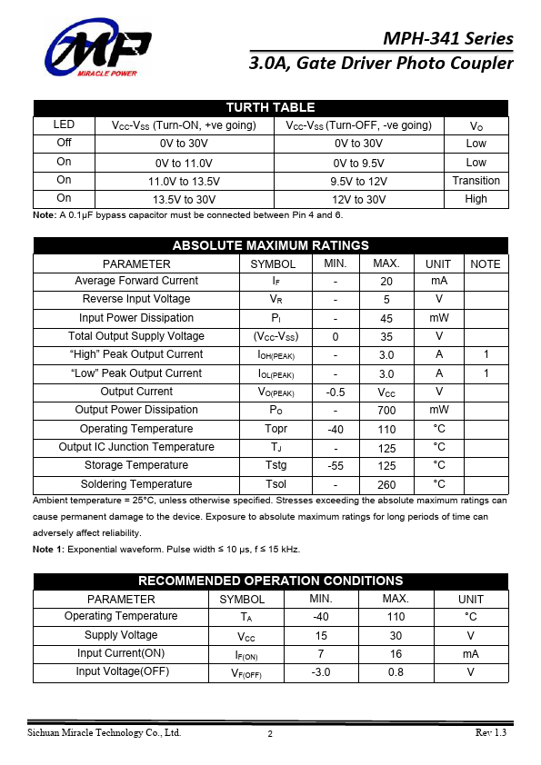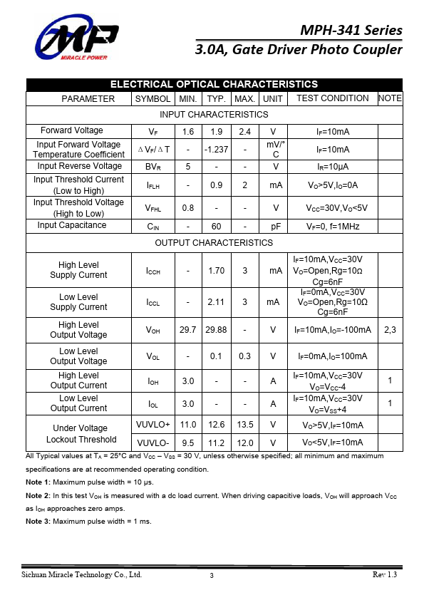 The MPH-341 series Photocoupler is ideally suited for driving power IGBTs and MOSFETs used in motor control inverter applications and inverters in power supply system. It contains an AlGaAs LED optically coupled to an integrated circuit with a power output stage. The 3.0A peak output current is capable of directly driving most IGBTs with ratings up to 1200 V/200.