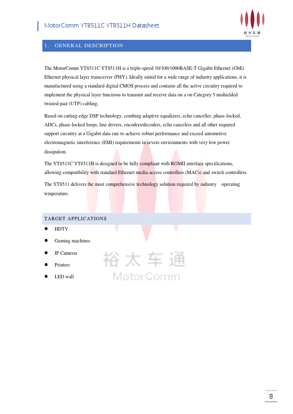 The Motorm YT8511C YT8511H is a triple-speed 10/100/1000BASE-T Gigabit Ethernet (GbE) Ethernet physical layer transceiver (PHY). Ideally suited for a wide range of industry applications, it is manufactured using a standard digital CMOS process and contains all the active circuitry required to implement the physical layer functions to transmit and receive data on a on Category 5 unshielded twisted-pair (UTP) cabling....