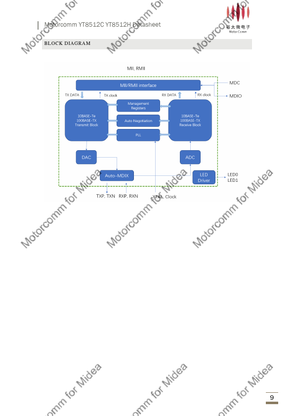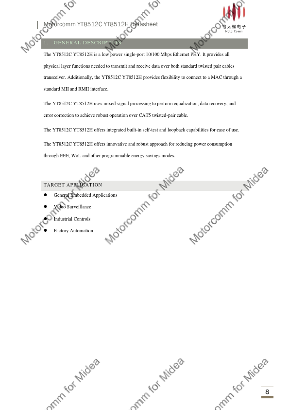 The YT8512C YT8512H is a low power single-port 10/100 Mbps Ethernet PHY. It provides all physical layer functions needed to transmit and receive data over both standard twisted pair cables transceiver. Additionally, the YT8512C YT8512H provides flexibility to connect to a MAC through a standard MII and RMII interface.