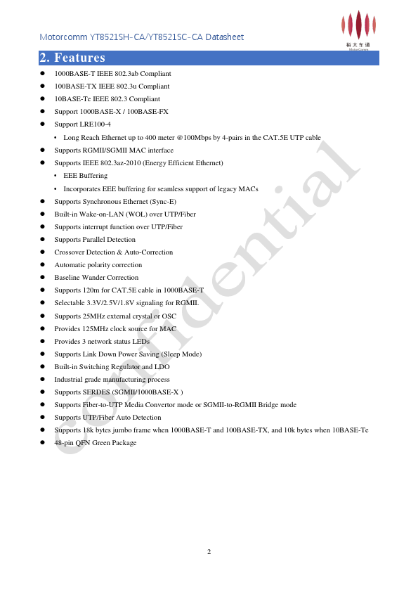The YT8521S is a highly integrated Ethernet transceiver that plies with 10BASE-Te, 100BASE-TX, and 1000BASE-T IEEE 802.3 standards. It provides all the necessary physical layer functions to transmit and receive Ethernet packets over CAT.5E UTP cable. The YT8521S uses state-of-the-art DSP technology and an Analog Front End (AFE) to enable high-speed data transmission and reception over UTP cable.