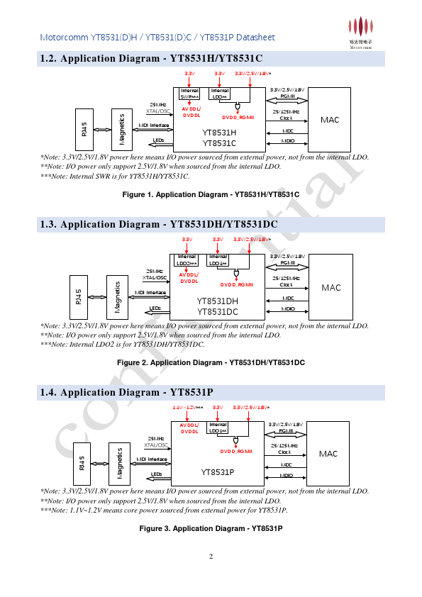 The YT8531H / YT8531C / YT8531DH / YT8531DC / YT8531P is a highly integrated Ethernet transceiver that plies with 10BASE-Te, 100BASE-TX, and 1000BASE-T IEEE 802.3 standards. It provides all the necessary physical layer functions to transmit and receive Ethernet packets over CAT.5E UTP cable. The YT8531(D)(P) uses state-of-the-art DSP technology and an Analog Front End (AFE) to enable high-speed data transmission and...