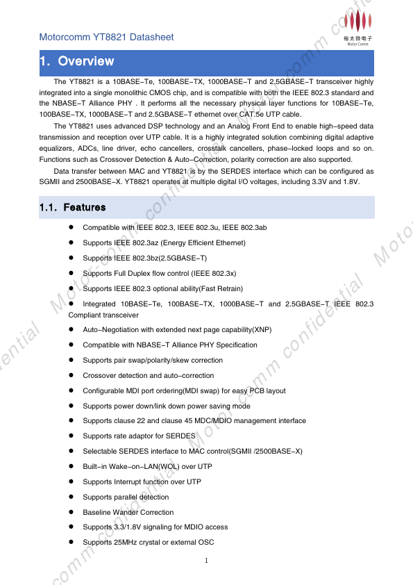 Overview m The YT8821 is a 10BASE-Te, 100BASE-TX, 1000BASE-T and 2.5GBASE-T transceiver highly r- integrated into a single monolithic CMOS chip, and is patible with both the IEEE 802.3 standard and to the NBASE-T Alliance PHY . It performs all the necessary physical layer functions for 10BASE-Te, o 100BASE-TX, 1000BASE-T and 2.5GBASE-T ethernet over CAT.5e UTP cable. M The YT8821 uses advanced DSP technology and an...
