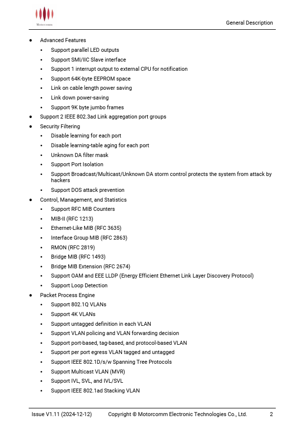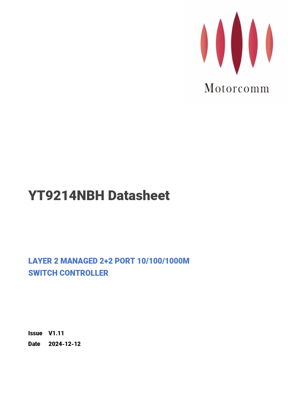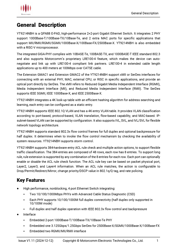General Description YT9214NBH is a QFN88 E-PAD, high-performance 2+2-port Gigabit Ethernet Switch. It integrates 2 PHY support 1000Base-T/100Base-TX/10Base-Te, and 2 extra MAC ports for specific applications that support MII/RMII/RGMII/SGMII/1000Base-X/100Base-FX/2500Base-X. YT9214NBH is also embedded with a RISC-V microprocessor.