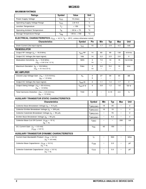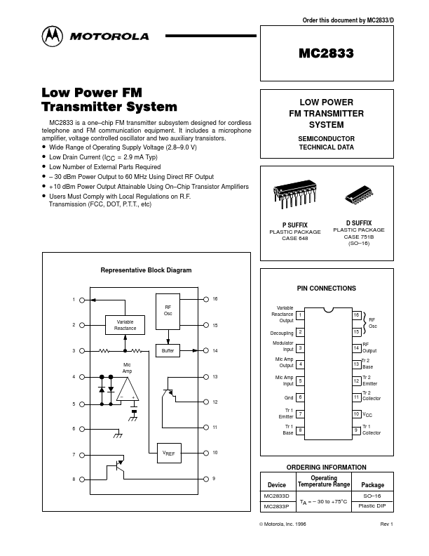 Order this document by MC2833/D MC2833 Low Power FM Transmitter System MC2833 is a one chip FM transmitter subsystem designed for cordless telephone and FM munication equipment. It includes a microphone amplifier, voltage controlled oscillator and two auxiliary transistors. Wide Range of Operating Supply Voltage (2.8 9.0 V) Low Drain Current (ICC = 2.9 mA Typ) Low Number of External Parts Required 30 dBm Power...
