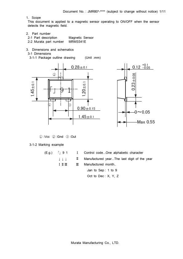 Dimensions and schematics 3-1 Dimensions 3-1-1 Package outline drawing (Unit :mm) ② 「」9 1 ① ③ ① :Vcc ② :Gnd ③ :Out 3-1-2 Marking example (E.g.) 「」9 1 ↓↓↓ ⅠⅡⅢ Ⅰ Control code...One alphabetic character Ⅱ Manufactured year...The last digit of the year Ⅲ Manufactured month..