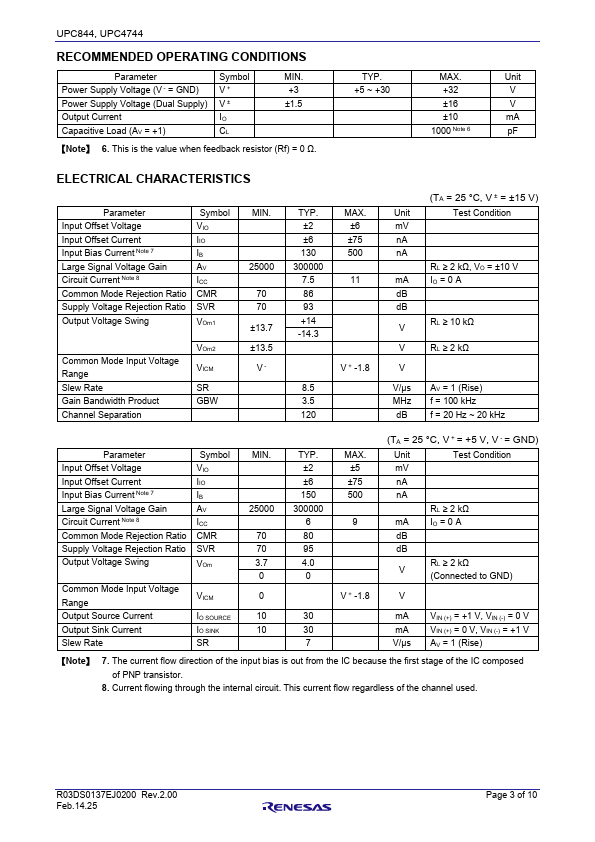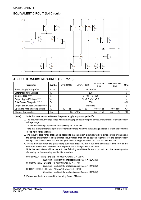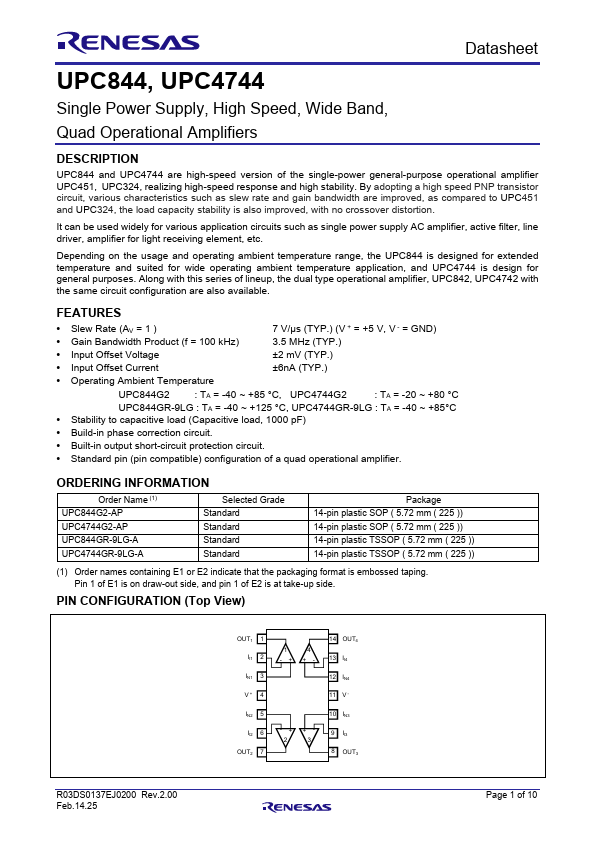 UPC844 and UPC4744 are high-speed version of the single-power general-purpose operational amplifier UPC451, UPC324, realizing high-speed response and high stability. By adopting a high speed PNP transistor circuit, various characteristics such as slew rate and gain bandwidth are improved, as pared to UPC451 and UPC324, the load capacity stability is also improved, with no crossover distortion. It can be used widely...