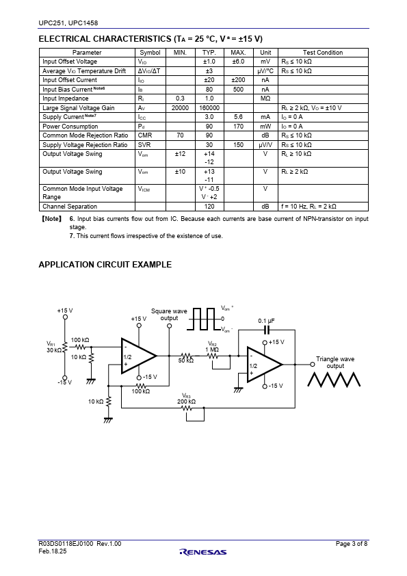 UPC251, 1458 are dual general purpose operational amplifiers having internal frequency pensating circuits. They are intended for a wide range of analog applications. High mon mode voltage range and no latch up tendencies make these amplifiers ideal for use as a voltage follower.