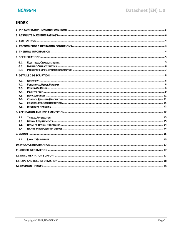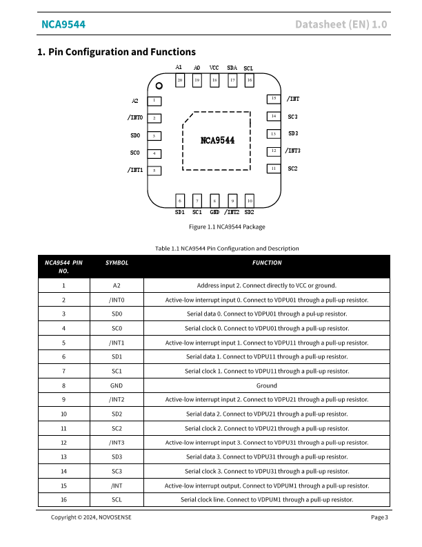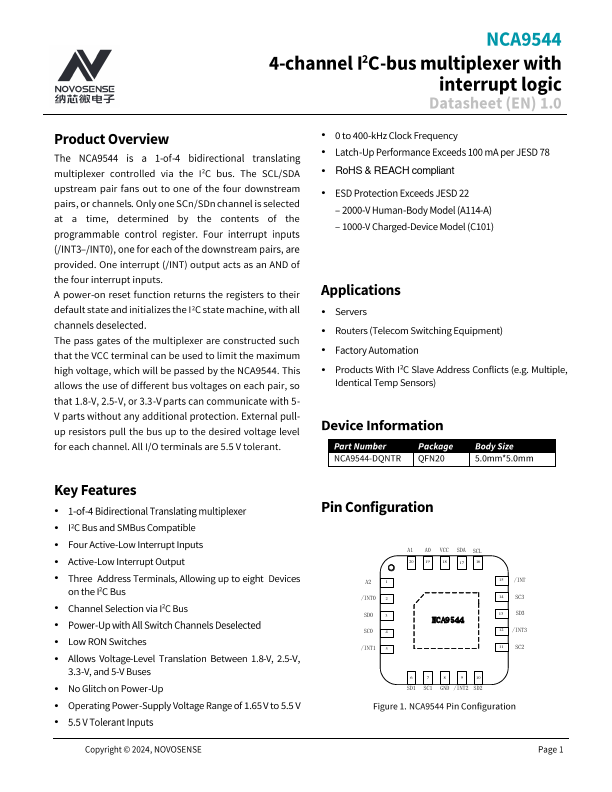 !P:I i'i!.i f~ Et!~ NCA9544 4-channel PC-bus multiplexer with interrupt logic Datasheet (EN) 1.0 Product Overview The NCA9544 is a 1-of-4 bidirectional translating multiplexer controlled via the 12C bus. The SCL/SDA upstream pair fans out to one of the four downstream pairs, or channels. Only one SCn/SDn channel is selected at a time, determined by the contents of the programmable control register.