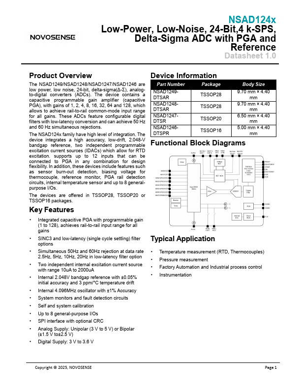 NSAD124x Low-Power, Low-Noise, 24-Bit,4 k-SPS, Delta-Sigma ADC with PGA and Reference Datasheet 1.0 Product Overview The NSAD1249/NSAD1248/NSAD1247/NSAD1246 are low power, low noise, 24-bit, delta-sigma(Δ-Σ), analogto-digital converters (ADCs). The device contains a capacitive programmable gain amplifier (capacitive PGA), with gains of 1, 2, 4, 8, 16, 32, 64 and 128, which allows to achieve rail-to-rail mon-mode...