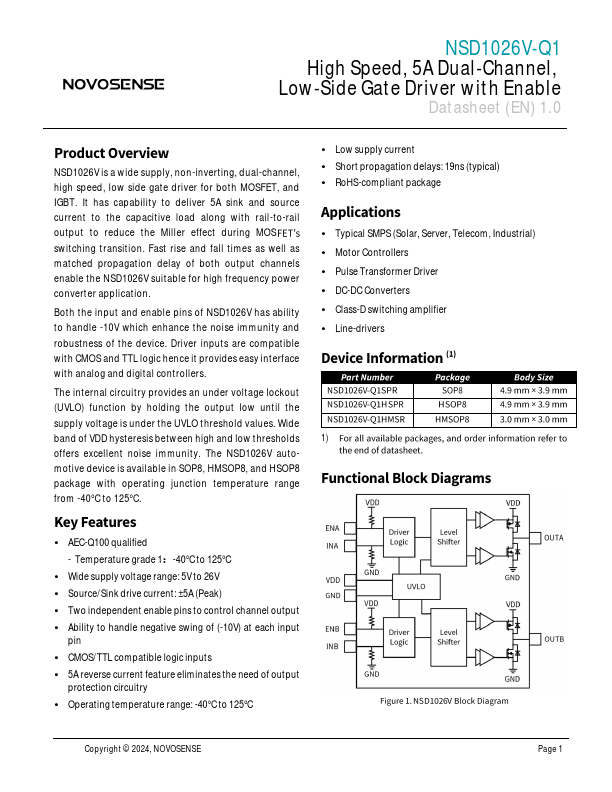 NSD1026V-Q1 High Speed, 5A Dual-Channel, Low-Side Gate Driver with Enable Datasheet (EN) 1.0 NSD1026V is a wide supply, non-inverting, dual-channel, high speed, low side gate driver for both MOSFET, and IGBT. It has capability to deliver 5A sink and source current to the capacitive load along with rail-to-rail output to reduce the Miller effect during MOS switching transition. Fast rise and fall times as well as...