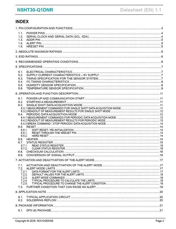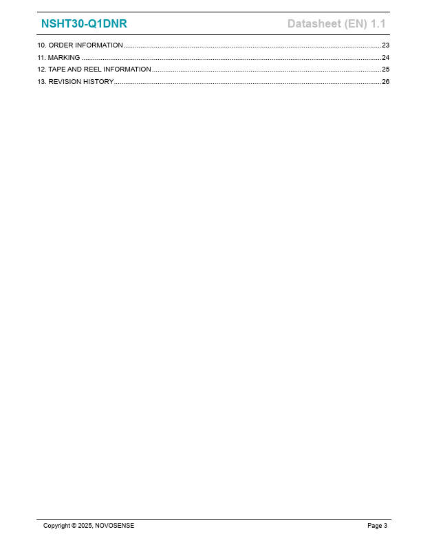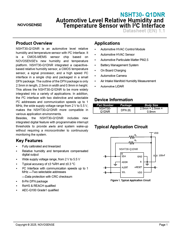 NSHT30- Q1DNR Automotive Level Relative Humidity and Temperature Sensor with I2C Interface Datasheet (EN) 1.1 Product Overview NSHT30-Q1DNR is an automotive level relative humidity and temperature sensor with I2C Interface. It is a CMOS-MEMS sensor chip based on NOVOSENSE's new humidity and temperature platform. NSHT30-Q1DNR integrated a capacitivebased relative humidity sensor, a CMOS temperature sensor, a signal...
