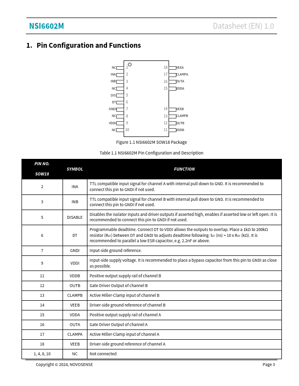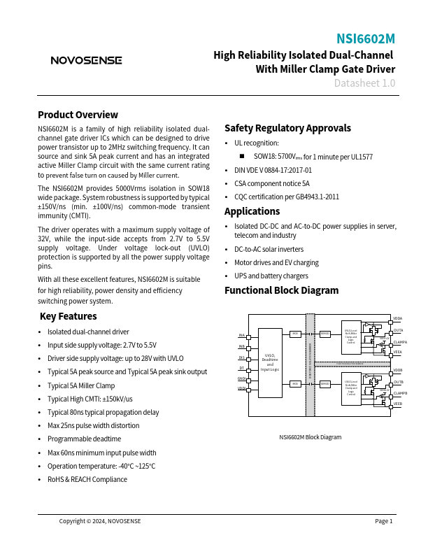 NSI6602M High Reliability Isolated Dual-Channel With Miller Clamp Gate Driver Datasheet 1.0 Product Overview NSI6602M is a family of high reliability isolated dualchannel gate driver ICs which can be designed to drive power transistor up to 2MHz switching frequency. It can source and sink 5A peak current and has an integrated active Miller Clamp circuit with the same current rating to prevent false turn on caused by...