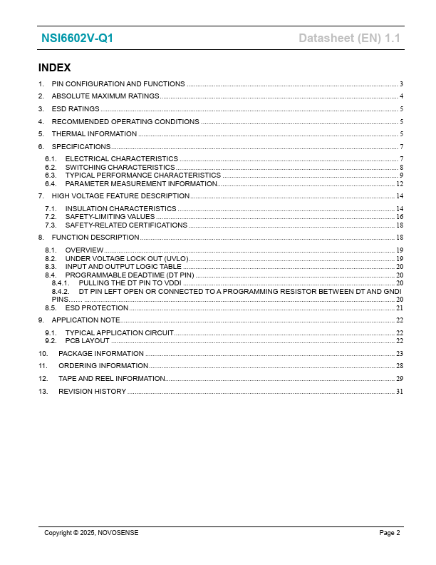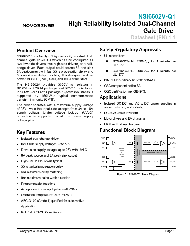 NSI6602V-Q1 High Reliability Isolated Dual-Channel Gate Driver Datasheet (EN) 1.1 Product Overview NSI6602V is a family of high reliability isolated dualchannel gate driver ICs which can be configured as two low-side drivers, two high-side drivers, or a halfbridge driver. Each output could source 6A and sink 8A peak current with fast 33ns propagation delay and 6ns maximum delay matching. It is designed to drive...
