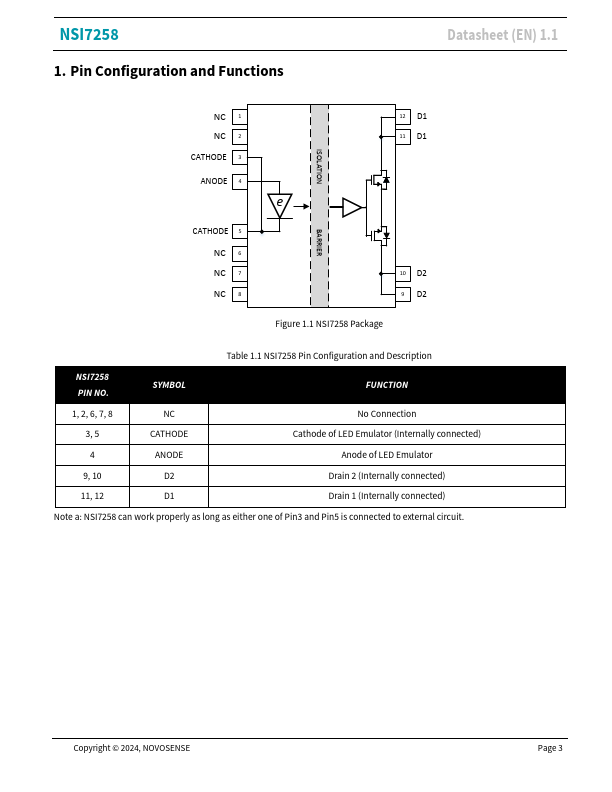 The NSI7258 is a single-channel solid-state relay (SSR), which is pin-compatible for popular photo MOSFET. The SSR turns ON with a minimum input current of 5.5mA. It can conduct 30mA current at ON state, with resistance less than 250Ω. The SSR turns off with an input voltage of 0.5V or less. It can withstand 1000V voltage at OFF state, with less than 1uA leakage current.