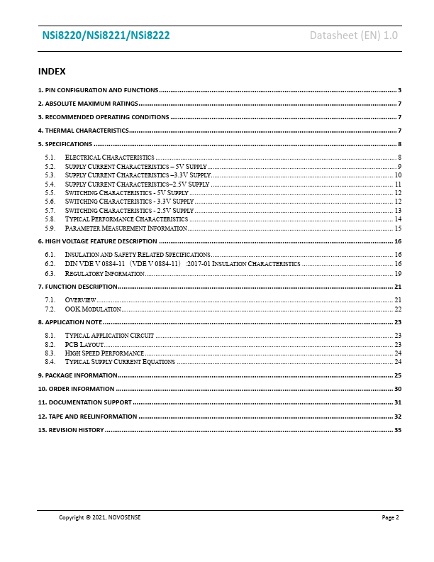 The NSi822x devices are high reliability dual-channel digital isolators. The NSi822x device is safety certified by UL1577 support several insulation withstand voltages (3.75kVrms, 5kVrms), while providing high electromagnetic immunity and low emissions at low power consumption. The data rate of the NSi822x is up to 150Mbps, and the common-mode transient immunity (CMTI) is up to 250kV/us. The NSi822x device provides digital channel direction configuration and the default output level configuration when the input power is lost. Wide supply voltage of the NSi822x device support to connect with most digital interface directly, easy to do the level shift.