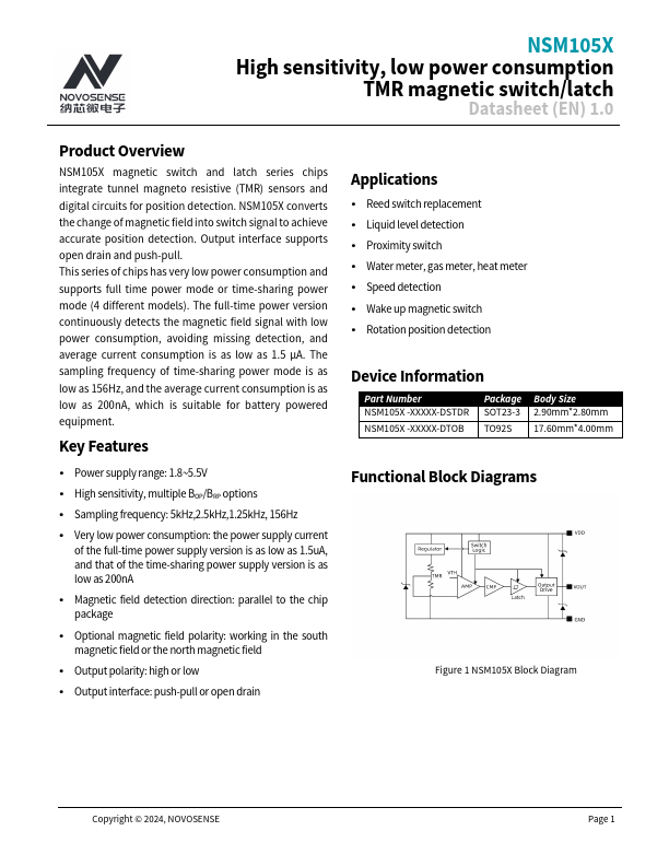 NSM105X High sensitivity, low power consumption TMR magnetic switch/latch Datasheet (EN) 1.0 Product Overview NSM105X magnetic switch and latch series chips integrate tunnel magneto resistive (TMR) sensors and digital circuits for position detection. NSM105X converts the change of magnetic field into switch signal to achieve accurate position detection. Output interface supports open drain and push-pull.