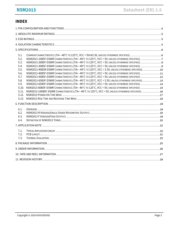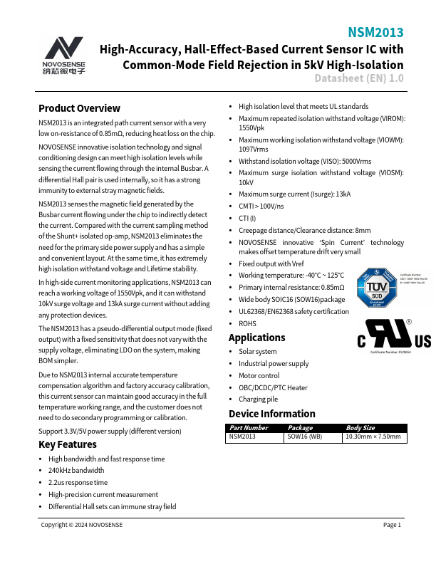 NSM2013 High-Accuracy, Hall-Effect-Based Current Sensor IC with mon-Mode Field Rejection in 5kV High-Isolation Datasheet (EN) 1.0 Product Overview NSM2013 is an integrated path current sensor with a very low on-resistance of 0.85mΩ, reducing heat loss on the chip. NOVOSENSE innovative isolation technology and signal conditioning design can meet high isolation levels while sensing the current flowing through the...
