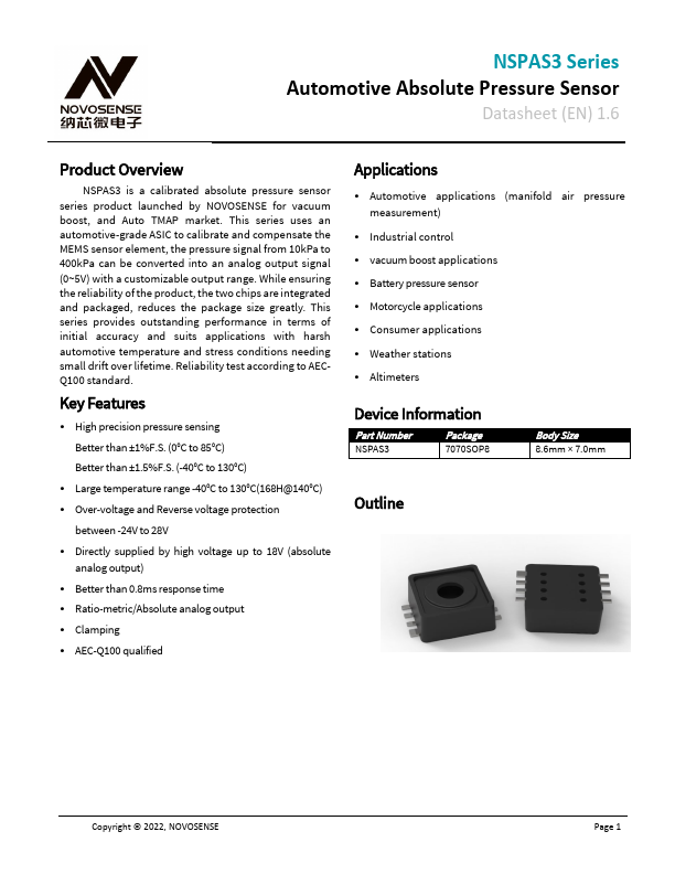 | NSPAS1 | Automotive Absolute Pressure Sensor |