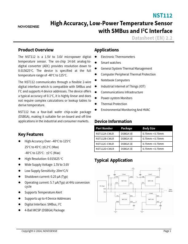 NST112 High Accuracy, Low-Power Temperature Sensor with SMBus and I2C Interface Datasheet (EN) 2.2 Product Overview Applications The NST112 is a 1.5V to 3.6V micropower digital temperature sensor. The on-chip 14-bit analog-todigital converter (ADC) provides resolution down to 0.015625°C. The device is specified at the full temperature range of -40°C to 125°C.