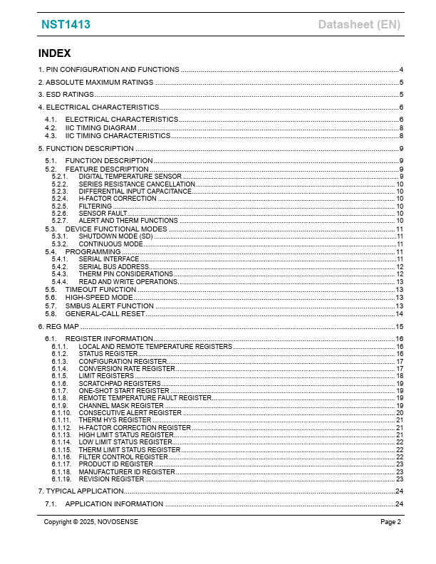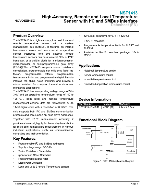NST1413 High-Accuracy, Remote and Local Temperature Sensor with I2C and SMBus Interface Datasheet (EN) Product Overview The NST1413 is a high accuracy, low cost, local and remote temperature sensor with a system management bus (SMBus).