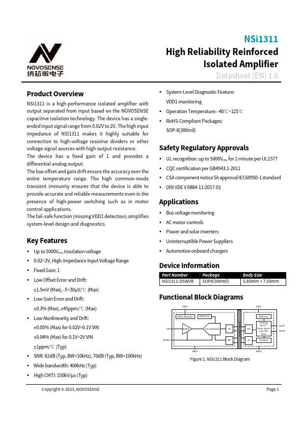 | NSi1311-Q1 | High Reliability Reinforced Isolated Amplifier |