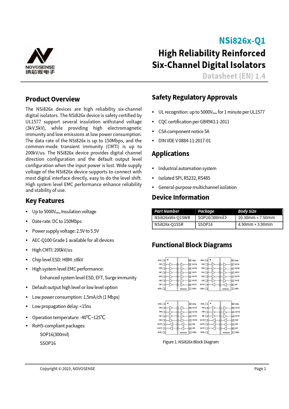 NSi826x-Q1 High Reliability Reinforced Six-Channel Digital Isolators Datasheet (EN) 1.4 Product Overview The NSi826x devices are high reliability six-channel digital isolators. The NSi826x device is safety certified by UL1577 support several insulation withstand voltage (3kV,5kV), while providing high electromagnetic immunity and low emissions at low power consumption. The data rate of the NSi826x is up to 150Mbps,...