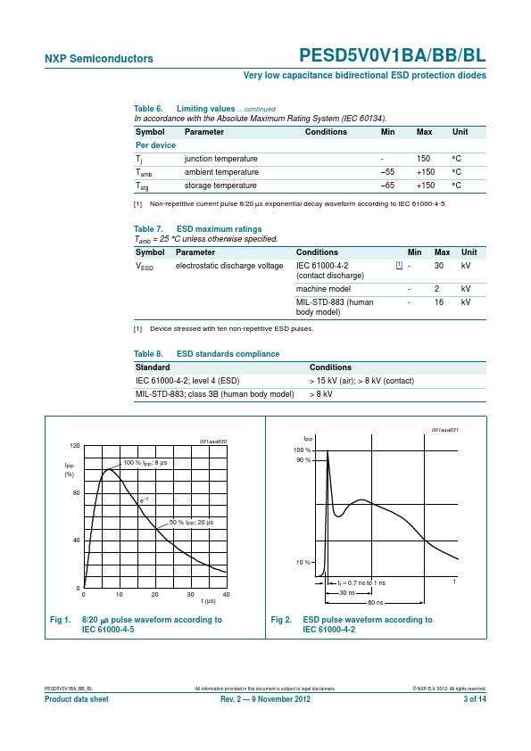 Very low capacitance bidirectional ElectroStatic Discharge (ESD) protection diodes in small Surface-Mounted Device (SMD) plastic packages designed to protect one signal line from the damage caused by ESD and other transients.