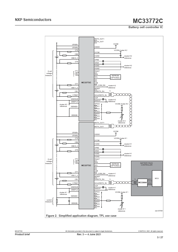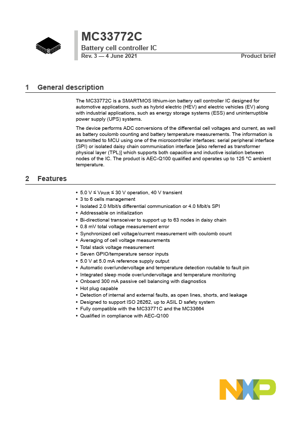 The MC33772C is a SMARTMOS lithium-ion battery cell controller IC designed for automotive applications, such as hybrid electric (HEV) and electric vehicles (EV) along with industrial applications, such as energy storage systems (ESS) and uninterruptible power supply (UPS) systems. The device performs ADC conversions of the differential cell voltages and current, as well as battery coulomb counting and battery...