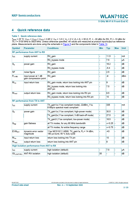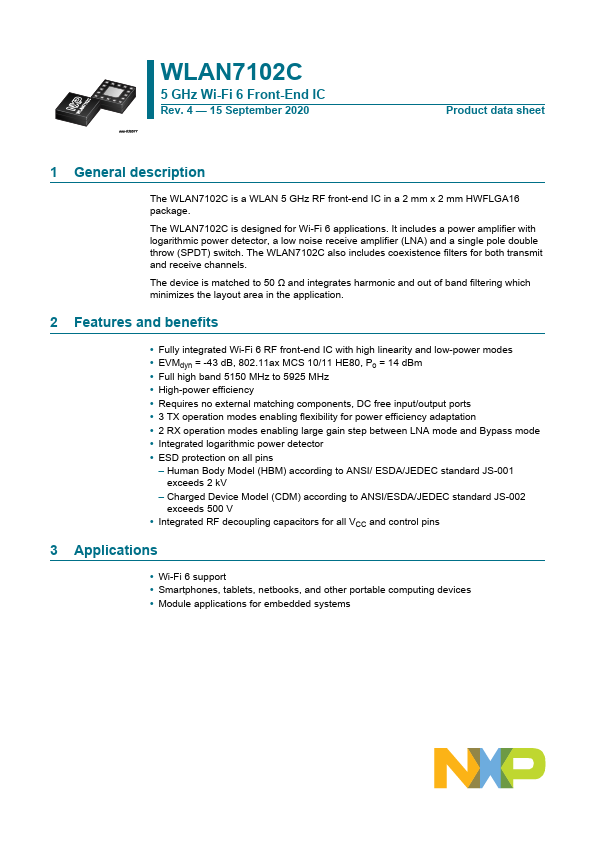The WLAN7102C is a WLAN 5 GHz RF front-end IC in a 2 mm x 2 mm HWFLGA16 package. The WLAN7102C is designed for Wi-Fi 6 applications. It includes a power amplifier with logarithmic power detector, a low noise receive amplifier (LNA) and a single pole double throw (SPDT) switch.