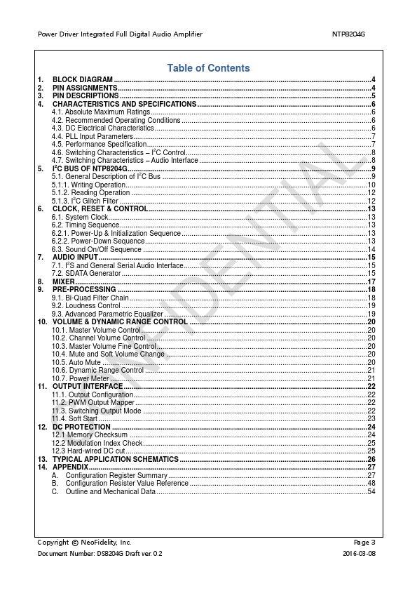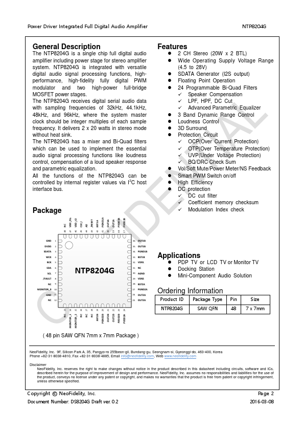 The NTP8204G is a single chip full digital audio amplifier including power stage for stereo amplifier system. NTP8204G is integrated with versatile digital audio signal processing functions, highperformance, high-fidelity fully digital PWM modulator and two high-power full-bridge MOSFET power stages. The NTP8204G receives digital serial audio data with sampling frequencies of 32kHz, 44.1kHz, 48kHz, and 96kHz, where...