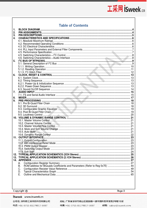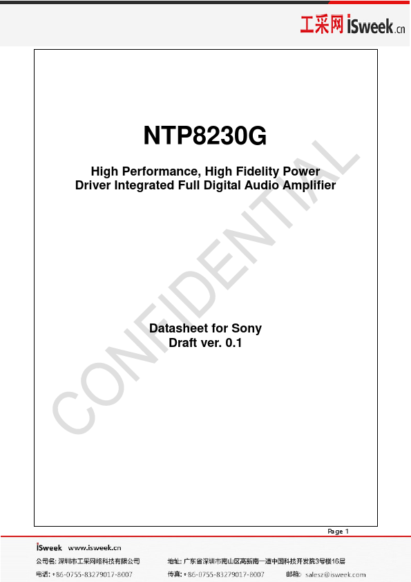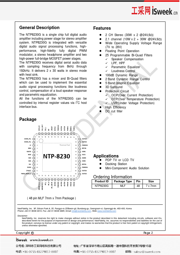 The NTP8230G is a single chip full digital audio amplifier including power stage for stereo amplifier system. NTP8230G is integrated with versatile digital audio signal processing functions, highperformance, high-fidelity fully digital PWM modulator, a stereo headphone amplifier and two high-power full-bridge MOSFET power stages. The NTP8230G receives digital serial audio data with sampling frequency from 8kHz...