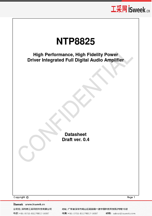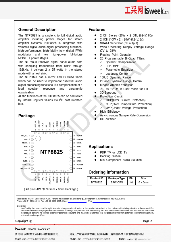 The NTP8825 is a single chip full digital audio amplifier including power stages for stereo amplifier systems. NTP8825 is integrated with versatile digital audio signal processing functions, high-performance, high-fidelity fully digital PWM modulator and two high-power full-bridge MOSFET power stages. The NTP8825 receives digital serial audio data with sampling frequencies from 8kHz through 192kHz.