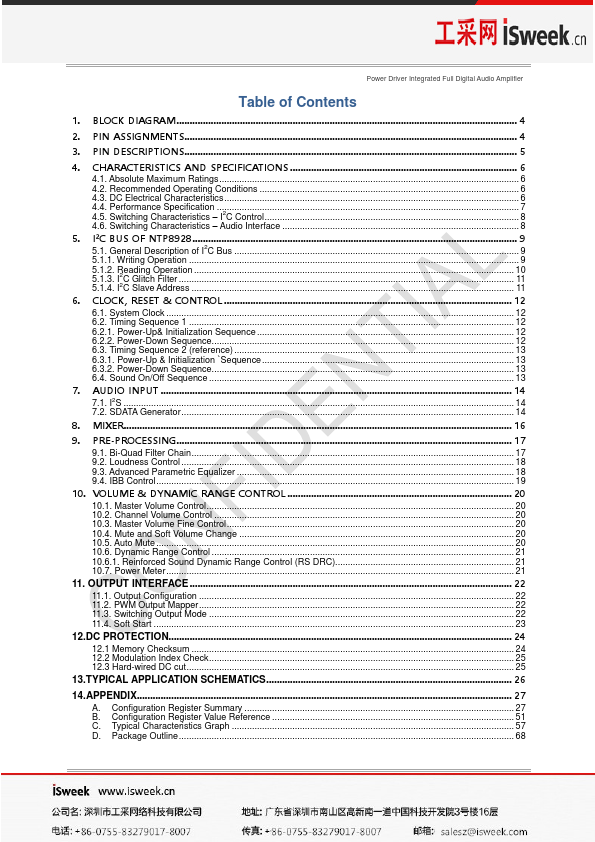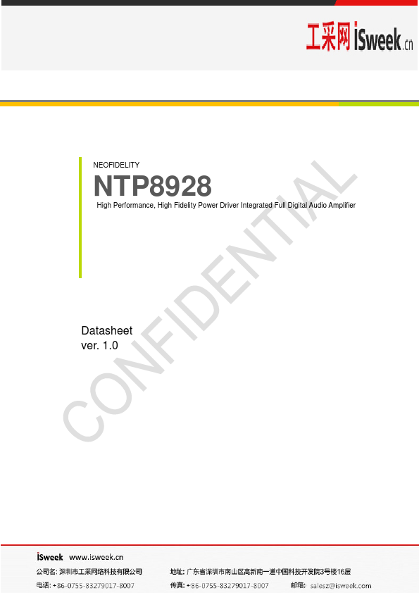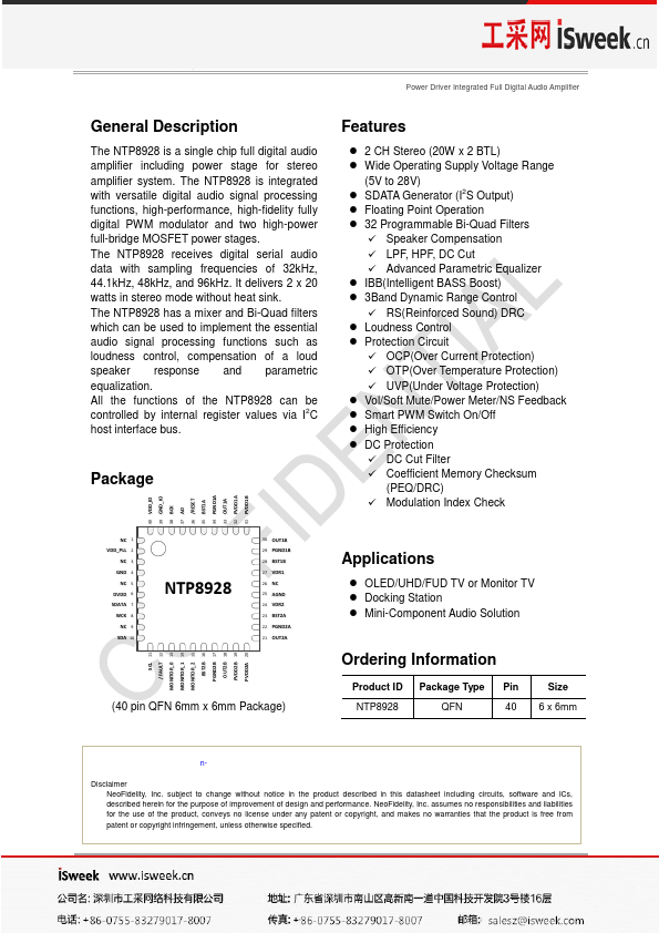 The NTP8928 is a single chip full digital audio amplifier including power stage for stereo amplifier system. The NTP8928 is integrated with versatile digital audio signal processing functions, high-performance, high-fidelity fully digital PWM modulator and two high-power full-bridge MOSFET power stages. The NTP8928 receives digital serial audio data with sampling frequencies of 32kHz, 44.1kHz, 48kHz, and 96kHz.