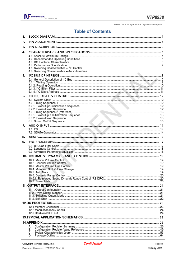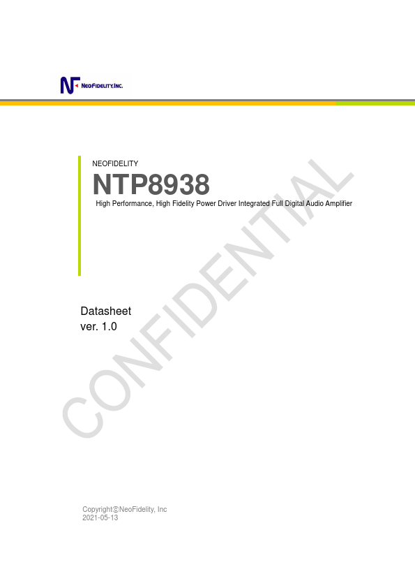 The NTP8938 is a single chip full digital audio amplifier including power stage for stereo amplifier system. The NTP8938 is integrated with versatile digital audio signal processing functions, high-performance, high-fidelity fully digital PWM modulator and two high-power full-bridge MOSFET power stages. The NTP8938 receives digital serial audio data with sampling frequencies of 32kHz, 44.1kHz, 48kHz, and 96kHz.