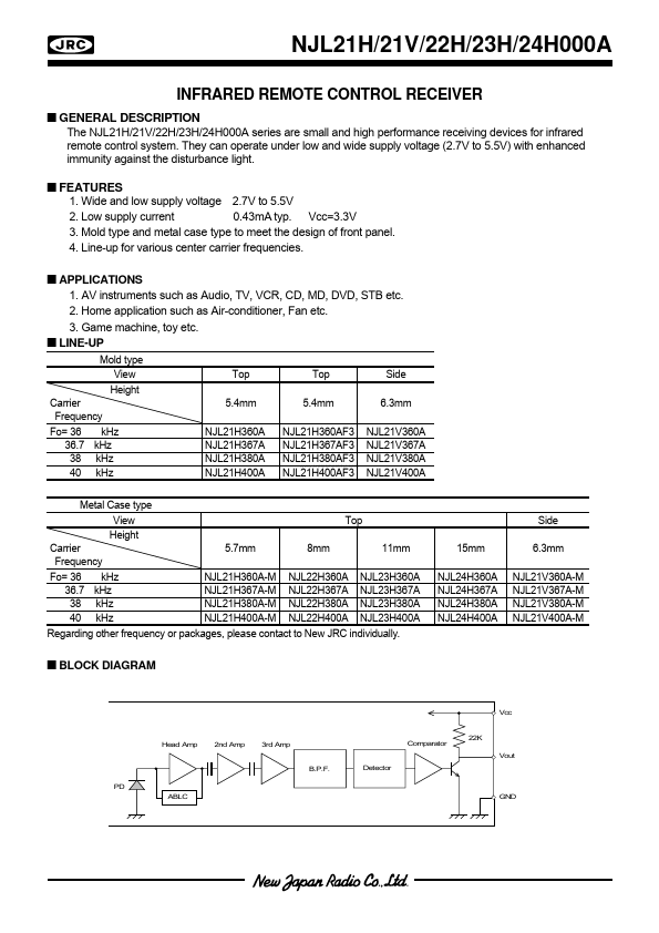 The NJL21H/21V/22H/23H/24H000A series are small and high performance receiving devices for infrared remote control system. They can operate under low and wide supply voltage (2.7V to 5.5V) with enhanced immunity against the disturbance light.
