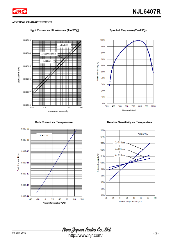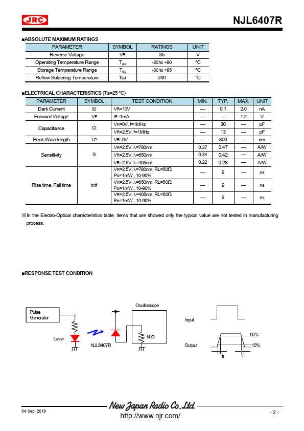 The NJL6407R is the photodiode sensor capable of detecting light in a wide wavelength range of up to infrared light from the blue-violet light. APPLICATION Laser monitor for Blu-ray, etc. Monitor for RGB wavelength Photoelectric switch, Space light transmitting, etc. BLOCK DIAGRAM PA PIN CONFIGURATION PIN NO.SYMBOL 1 PA 2 PK PK DESCRIPTION Anode Cathode (Top View) 1