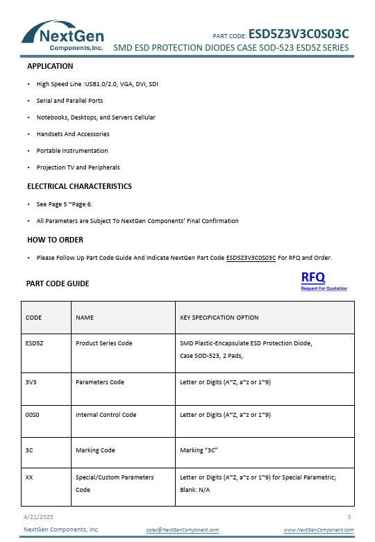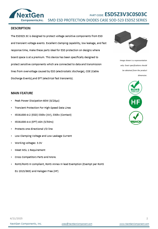 The ESD5Z3.3C is designed to protect voltage sensitive ponents from ESD and transient voltage events. Excellent clamping capability, low leakage, and fast response time, make these parts ideal for ESD protection on designs where board space is at a premium. This device has been specifically designed to protect sensitive ponents which are connected to data and transmission lines from overvoltage caused by ESD...