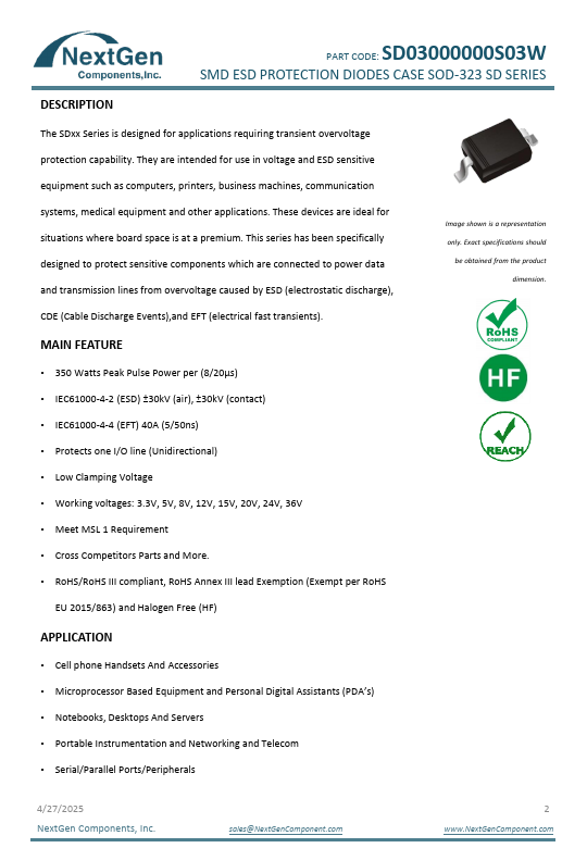 The SDxx Series is designed for applications requiring transient overvoltage protection capability. They are intended for use in voltage and ESD sensitive equipment such as puters, printers, business machines, munication systems, medical equipment and other applications. These devices are ideal for situations where board space is at a premium.