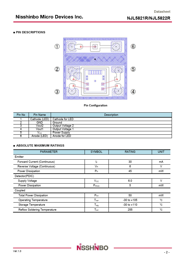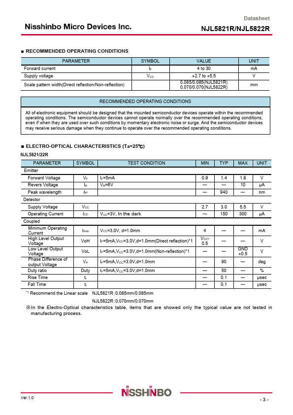 Miniature, thin package: 2.6mm x 2.5mm x 0.8mm Digital two outputs type: A,B phases Operating temperature range: -30 to +105℃ Resolution: NJL5821R 150LPI、NJL5822R 180LPI Pb free soldering re-flowing permitted: 255℃,2times Halogen free, Pb free Compliant with RoHS directive NJL5821R/NJL5822R(Hereinafter referred to as NJL5821/22R) are the compact surface mount type photo reflector, which is built in a high brightness Infrared LED and PDIC.It can obtain