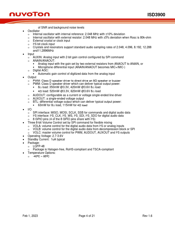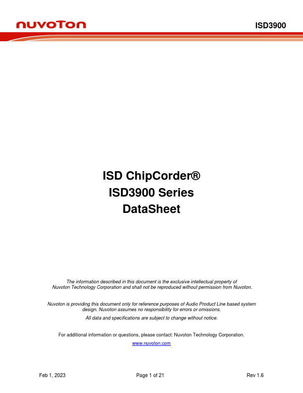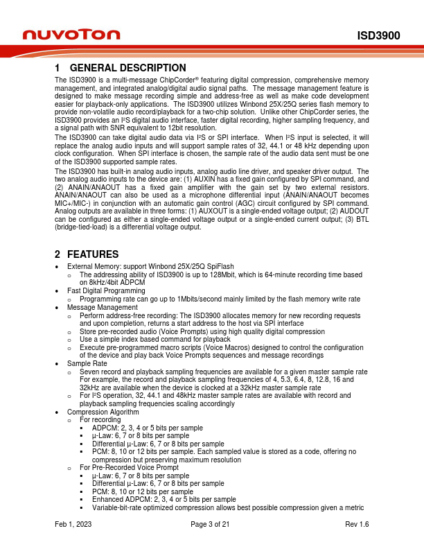 The ISD3900 is a multi-message ChipCorder® featuring digital pression, prehensive memory management, and integrated analog/digital audio signal paths.