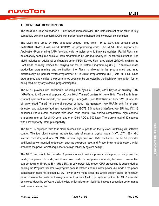 The ML51 is a Flash embedded 1T 8051-based microcontroller. The instruction set of the ML51 is fully patible with the standard 80C51 with performance enhanced and low power consumption. The ML51 runs up to 24 MHz at a wide voltage range from 1.8V to 5.5V, and contains up to 64/32/16/8 Kbytes Flash called APROM for programming code.