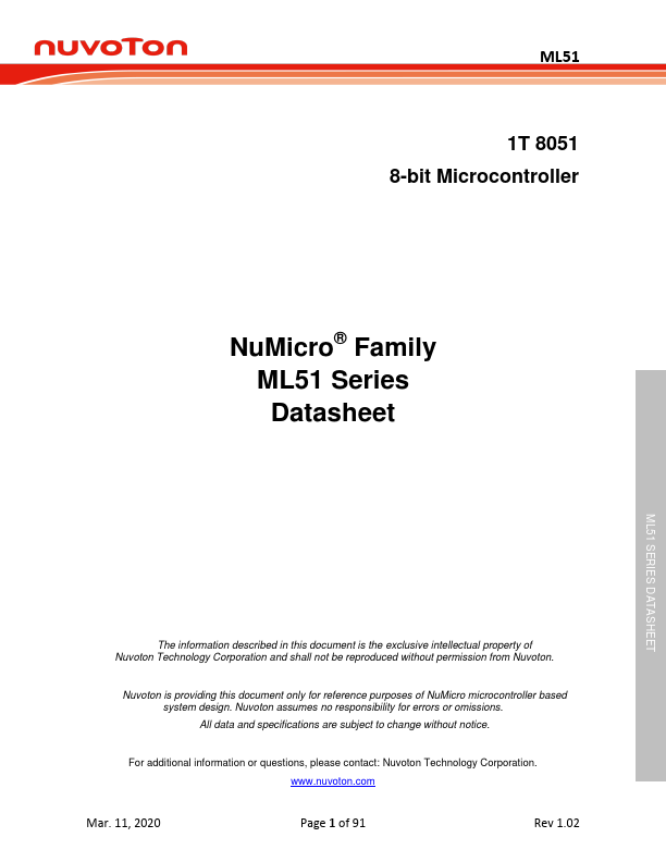 The ML51 is a Flash embedded 1T 8051-based microcontroller. The instruction set of the ML51 is fully patible with the standard 80C51 with performance enhanced and low power consumption. The ML51 runs up to 24 MHz at a wide voltage range from 1.8V to 5.5V, and contains up to 64/32/16/8 Kbytes Flash called APROM for programming code.
