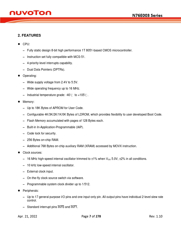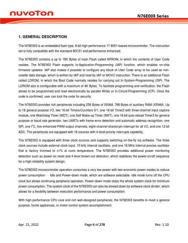 The N76E003 is an embedded flash type, 8-bit high performance 1T 8051-based microcontroller. The instruction set is fully patible with the standard 80C51 and performance enhanced. The N76E003 contains a up to 18K Bytes of main Flash called APROM, in which the contents of User Code resides.