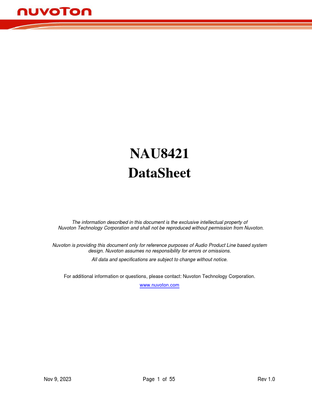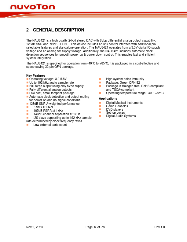 The NAU8421 is a high quality 24-bit stereo DAC with 8Vpp differential analog output capability, 128dB SNR and -99dB THDN. This device includes an I2C control interface with additional pin selectable.